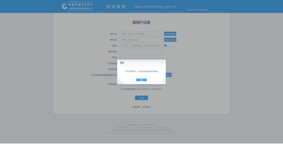 根据页面提示输入用户的注册信息,带*号的均为必填项。为确保申请人获得本币交易员资格后能在本币交易系统顺利完成实名认证,报名时请务必填写正确的有效身份证件号码。信息提交后如果注册成功,可以看到提示框,如下图所示: