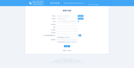首次使用在线报名功能,应先注册账号。注册用户只能为用户本人申请培训报名。点击登录页面的“新用户注册”,即可进入本币培训报名的注册页面,如下图所示: