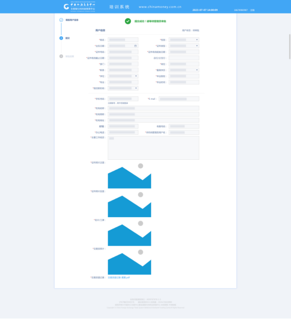 交易中心对用户信息进行预审后,将向用户的注册手机/邮箱发送预审情况通知短信及邮件。若预审未通过,用户需根据要求对用户信息进行修改后再次提交;若预审通过,用户重新登录即可进入远程培训系统首页。