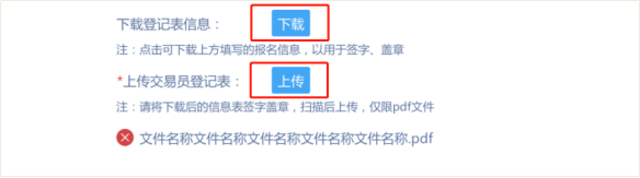 用户在填报用户信息页面下载登记表,在打印出的登记表上签名并粘贴本人的2寸彩色证件照片,加盖机构公章后扫描成 pdf 电子文件,点击“上传”按钮进行上传,位置如下图所示: