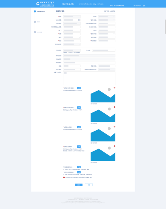填报用户信息页面根据页面提示要求上传证件照片正反面,名片/工牌、交易员照片、交易员登记表。可以点击已上传的图片进行预览。