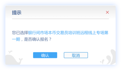 2.培训期次报名。用户点击希望参加的培训期次前的“报名”按钮,进行报名,弹出如下提示框,点击“确认”按钮后,即可完成报名。若报名人数已满,用户可选择其他期次或拨打培训服务电话请求人工帮助。