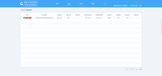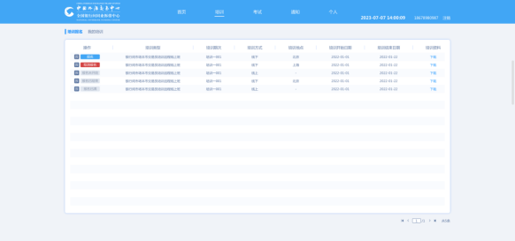 报名成功的培训期次,用户可以在“我的培训”菜单列表中查看,培训状态将变为“待审批”状态。 在这个界面上,用户可以取消报名,还可下载培训资料。如下图所示: